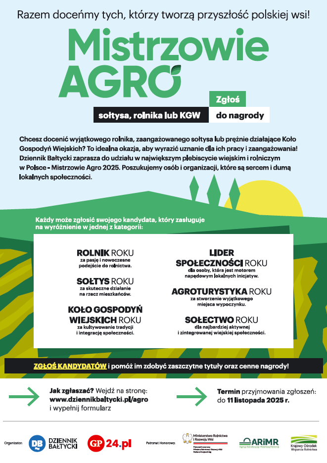 Szczegółowe informacje na stronie: https://dziennikbaltycki.pl/mistrzowie-agro-2025-wielki-plebiscyt-rozpoczety-zglos-do-nagrody-soltysa-rolnika-kgw-i-innych-przedstawicieli-wiejskich/ar/c8-19109900