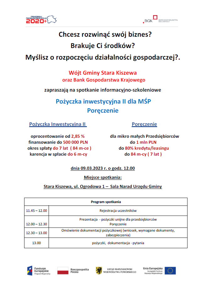 Zapraszamy na spotkanie informacyjno-szkoleniowe dotyczące "Pożyczki inwestycyjnej II" oraz "Poręczeń" dla sektora MŚP, które poprowadzi przedstawiciel Banku Gospodarstwa Krajowego. Spotkanie odbędzie się dnia 9 marca 2023 r. od godz. 12.00 w Sali Narad Urzędu Gminy Stara Kiszewa.