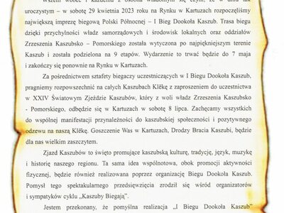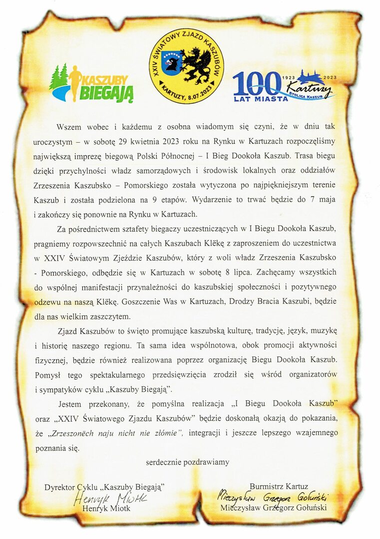 W niedzielę 7 maja przez Gminę Stara Kiszewa przebiegał ostatni - dziewiąty etap Biegu Dookoła Kaszub. Jeden z przystanków na trasie biegu odbył się w Parku Jaśminowym w Nowych Polaszkach. Tam również przez Pana Henryka Miotk na ręce wójta Gminy Stara Kiszewa Mariana Pick została przekazana Klëka z informacją o Światowym Zjeździe Kaszubów, który już w lipcu odbędzie się w Kartuzach. Warto dodać, że na odcinku biegu z Nowych Polaszek do Starych Polaszek wzięli udział mieszkańcy Naszej Gminy, którzy otrzymali pamiątkowy medal.