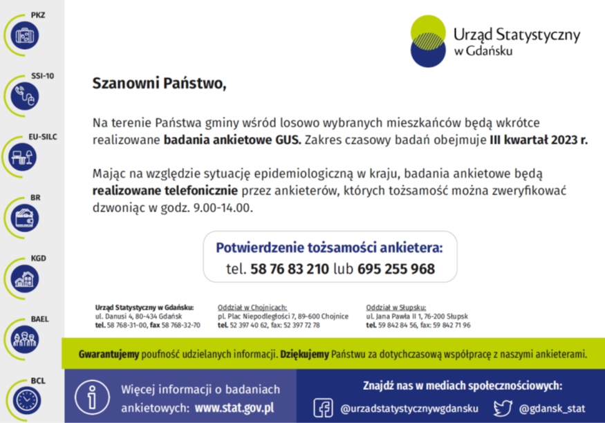 Główny Urząd Statystyczny informuje, że na terenie Gminy Stara Kiszewa, wśród losowo wybranych mieszkańców, będą realizowane badania aknietowe, które będą obejmować III kwartał 2023 r. Badania będą odbywać się telefonicznie.