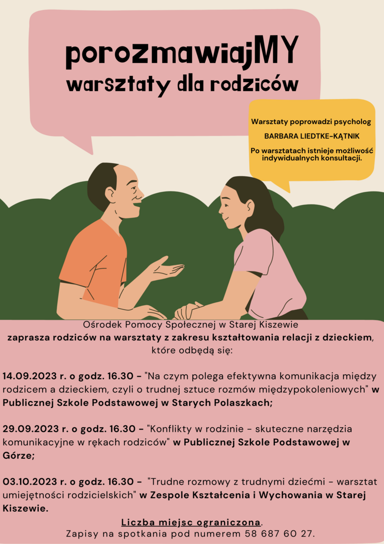 Ośrodek Pomocy Społecznej w Starej Kiszewie zaprasza rodziców na warsztaty z zakresu kształtowania relacji z dzieckiem.