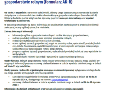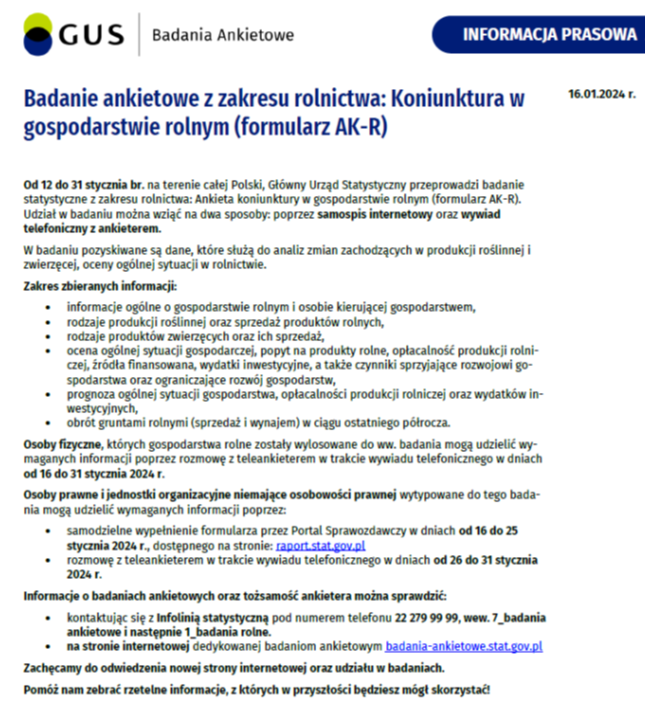 Badanie ankietowe GUS - Koniunktura w gospodarstwach rolnych