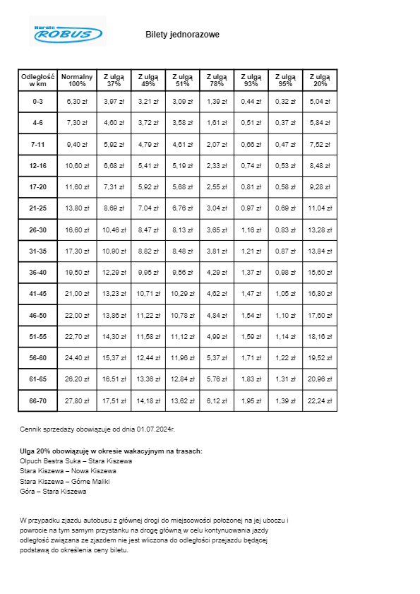 Rozkład jazdy poszczególnych linii jest dostępny w załącznikach oraz na przystankach, lokalnych sklepach i Urzędzie Gminy w Starej Kiszewie. Bilety można nabywać u kierowców. Przejazdy są biletowane zgodnie z cennikiem przewoźnika firmy ROBUS (cennik w załącznikach) z uwzględnieniem przysługujących ustawowych zniżek. Na czas wakacji od podanych cen przysługuje 20% zniżka.